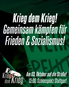 - Krieg dem Krieg – Gemeinsam kämpfen für Frieden und Sozialismus! Am 03. Oktober auf die Straße!Wir steuern auf unfriedliche Zeiten zu. Weltweit spitzen sich die Widersprüche zu und alles deutet auf eine neue globale Konflikteskalation hin. Die imperialistischen Staaten – angeführt von den USA, aber mit tatkräftiger Unterstützung Deutschlands – treiben die Welt gezielt an den Rand des Abgrunds. Ihr Ziel ist die Sicherung der eigenen Macht und Profite inmitten… Krieg dem Krieg – Gemeinsam kämpfen für Frieden und Sozialismus! Am 03. Oktober auf die Straße! weiterlesen